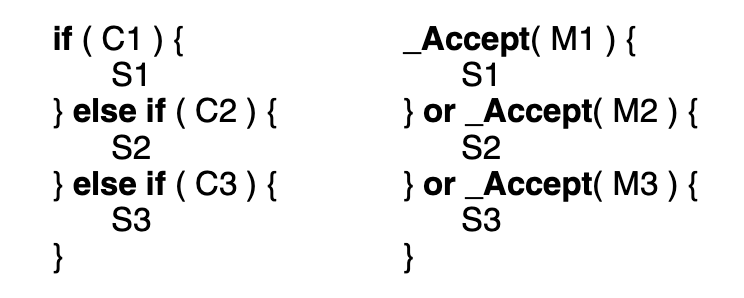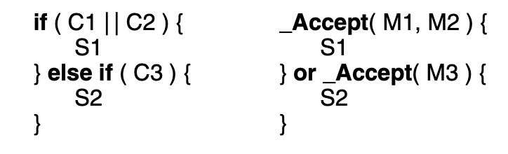 The if statement only executes one of S1, S2, S3; it does not execute them all. The reason is that the first conditional to evaluate to true executes its corresponding “then” clause (S1, S2, or S3), and the if statement terminates. Similarly, the accept statement accepts the first call to one of mutex members M1, M2, or M3, then executes the corresponding “then” clause (S1, S2, or S3) and the _Accept statement terminates. The analogue also holds when there is a list of mutex member names in an accept clause, as in: