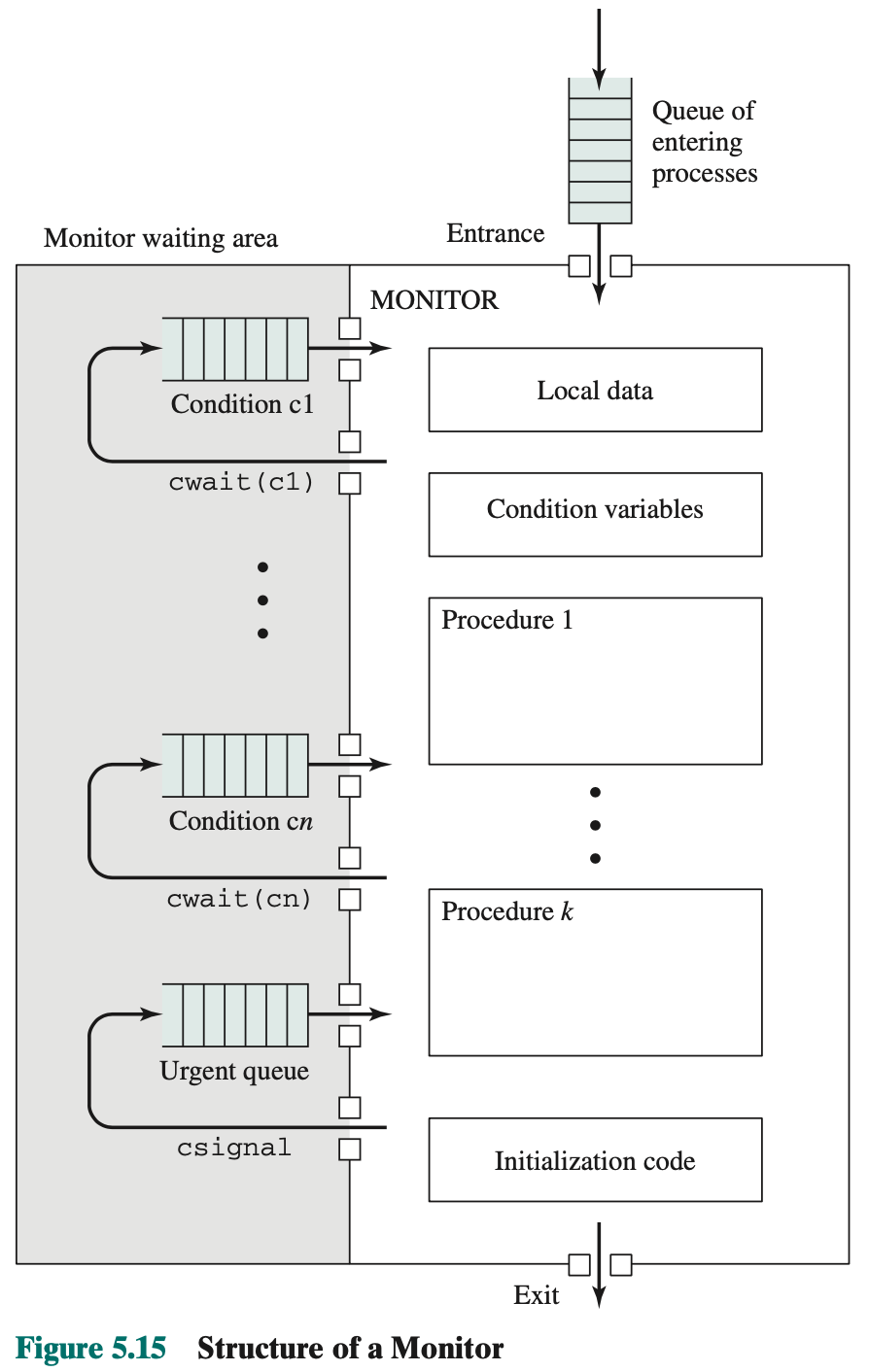 In the case of monitors, the monitor construct itself enforces mutual exclusion: It is not possible for both a producer and a consumer simultaneously to access the buffer. However, the programmer must place the appropriate cwait and csignal primitives inside the monitor to prevent processes from depositing items in a full buffer or removing them from an empty one. In the case of semaphores, both mutual exclusion and synchronization are the responsibility of the programmer.