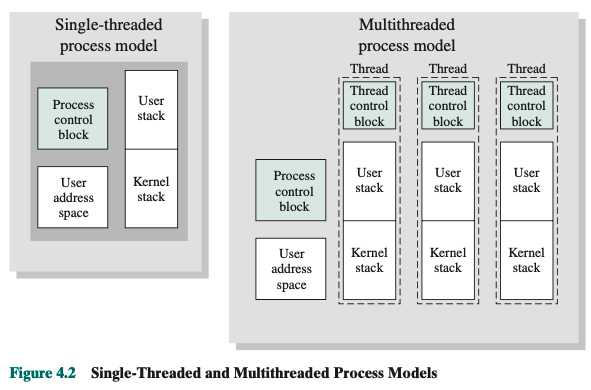 In multithreaded environment, there is still a single process control block and user address space associated with the process, but now there are separate stacks for each thread, as well as a separate control block for each thread containing register values, priority, and other thread-related state information.