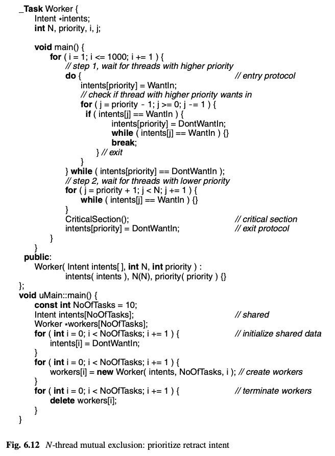 - second step: a thread searches in the low-priority, searching thread never retracts its intent; just busy waits until low-priority thread retracts its intent either by leaving the CS or retracting its intent in the entry protocol and continues along the list: