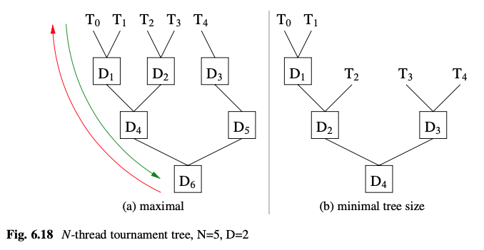 For all trees, threads start at the leaves of the tree, and Ne levels of internal nodes are needed to implement the tournament.
