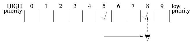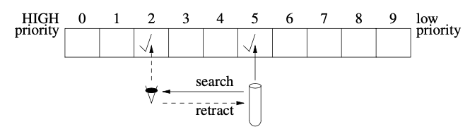 - sets its own intent, and then linearly search in the high-priority to see if a higher priority has declared intent. If found, searching thread retracts its intent and busy waits until the higher priority thread retracts its intent, and then searching thread begins the search over again from its starting position as in: