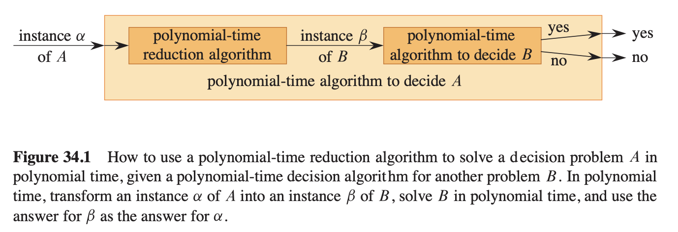 Consider a decision problem , which you would like to solve in polynomial time. We call the input to a particular problem an instance of that problem. Now suppose that you already know how to solve a different decision problem in polynomial time. Finally, suppose that you have a procedure that transforms any instance of into some instance of with the following characteristics: