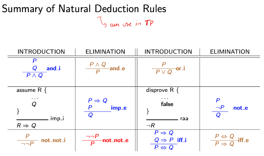 Definition: Natural deduction is a proof theory for showing the validity of an argument in propositional logic. A collection of rules, called inference rules, each of which allos us to infer new formulas from given formulas. A form of forward proof. Starting from the presmises, use inference rules to deduce new formulas that logically follow from the premises. Using the formulas we have proven and the premises, we use the rules to deduce more formulas, continue this process until we have deduced the conclusion. P1, P2, …, Pn Q