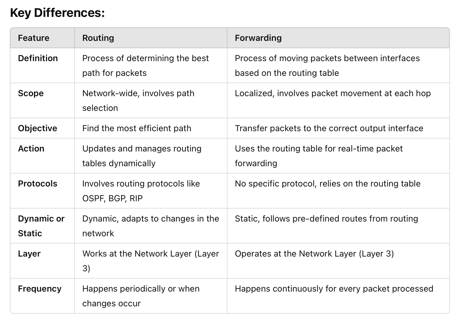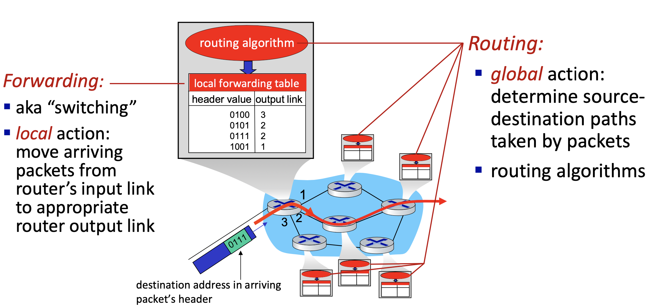 Ex: When a packet arrives at a router, the router looks at its destination IP address, checks its forwarding table, and sends the packet to the next router or destination node based on the forwarding decision.