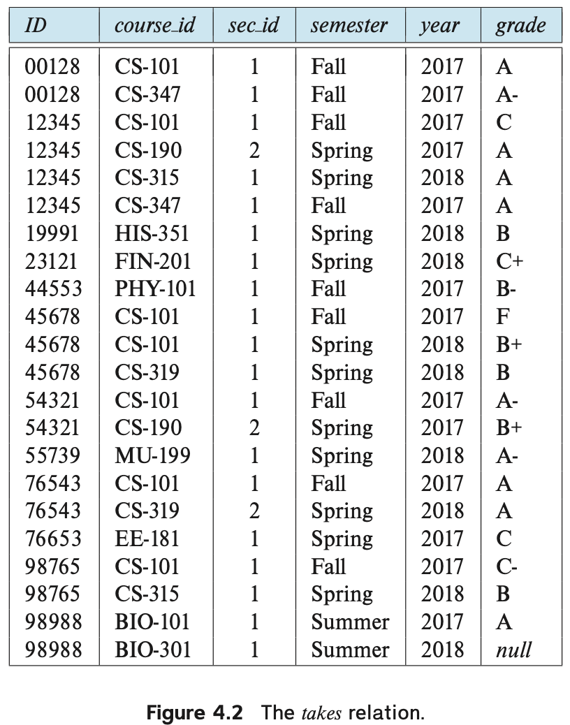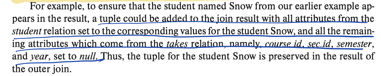 from student natural left outer join takesThe query does NOT work. Since natural join drops any tuple that does not match with the second relation’s tuple. The students with no courses will not get matched, therefore would not appear in the result.