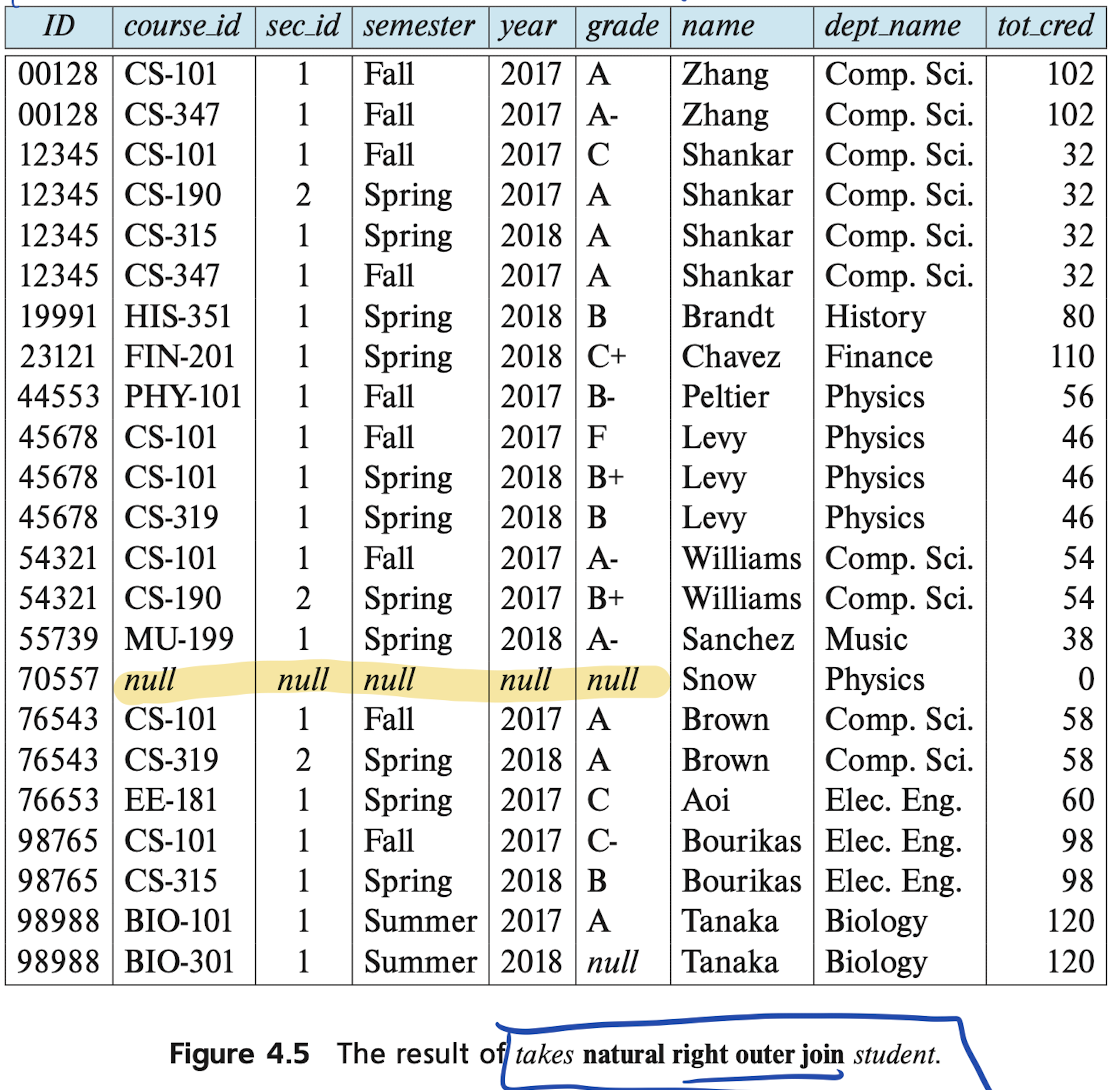 right outer join, it preserves tuples from student (which is the right in our case) and pad withnullall other attributes.