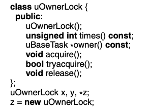 times()returns the number of times the lock has been acquired by the lock ownerowner()returns the task owning the lock or NULL if there is no owneracquire()acquires the lock if it is open, otherwise the calling task blocks until it can acquire the lock- i.e., it does not block; the value true is returned if the lock is acquired and false otherwise.
