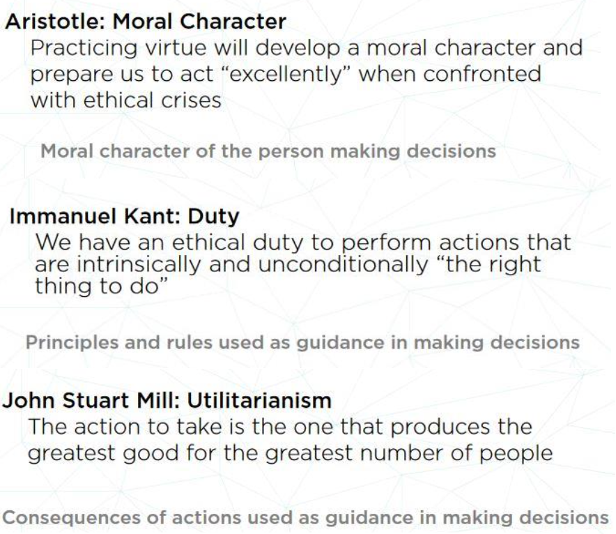 Note how these three theories focus on different aspects of ethical decision-making. Aristotelian ethics emphasizes the moral character and disposition of the person who is making decisions. Kantian ethics looks at concrete principles and rules that can be used to provide guidance when making or defending ethical decisions. Millsian ethics says that we must consider also the consequences of our actions when making decisions.