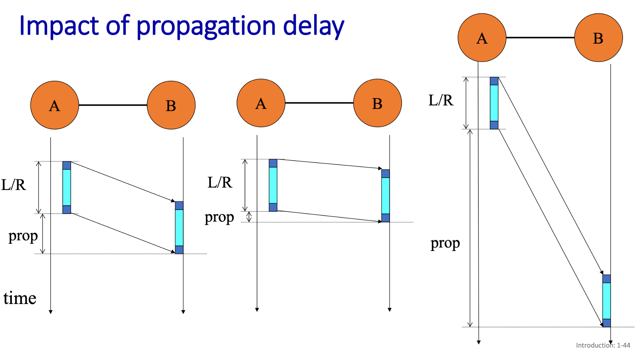 - Shows how, even after the entire packet has been transmitted (after L/RL/R), the propagation delay significantly adds to the total time before the packet reaches B.