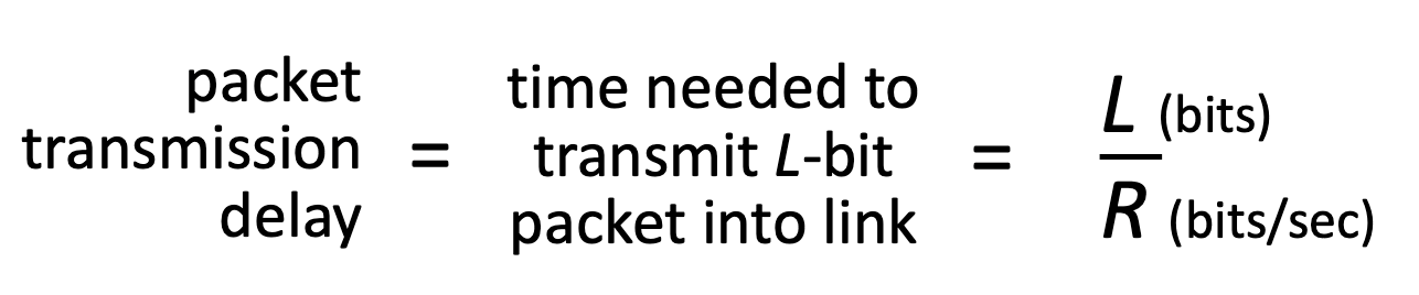 takes L/R seconds to transmit (push out) L-bit packet into link at R bps.