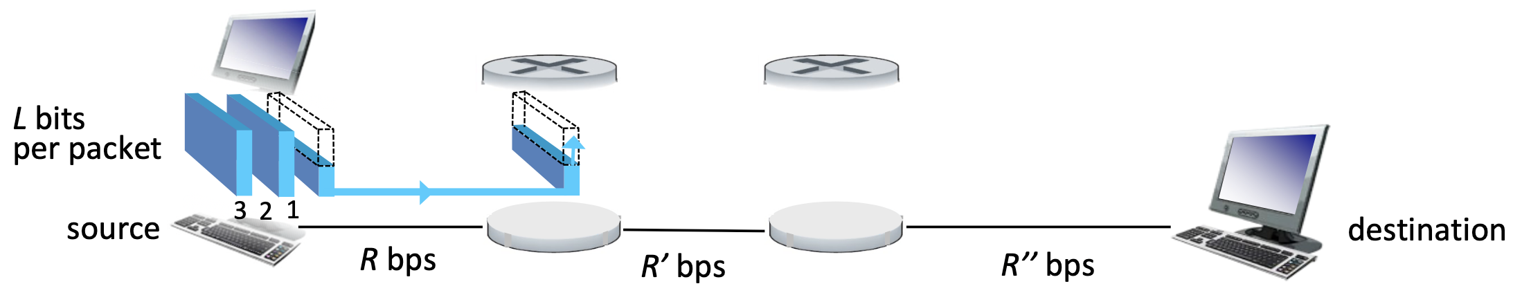 Takes L/R+prop seconds (prop = propagation delay) for the packet to fully arrive at the receiver.