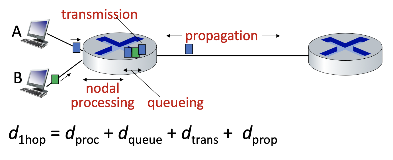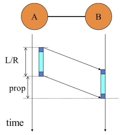 - The total time for the packet to arrive at B is the sum of the transmission delay L/RL/R and the propagation delay prop.