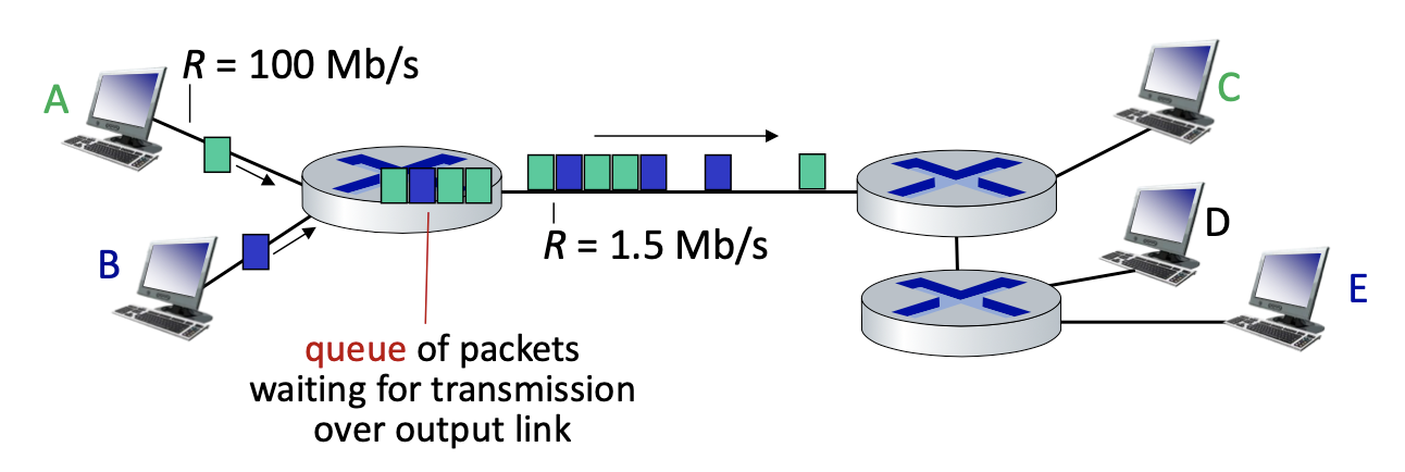 - packets queue in router buffers, waiting for turn for transmission