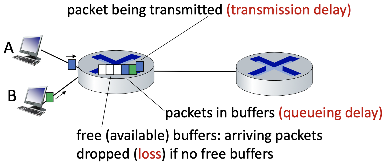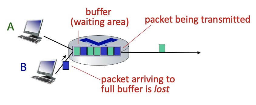 - packet loss occurs when buffer to hold queued packets fills up