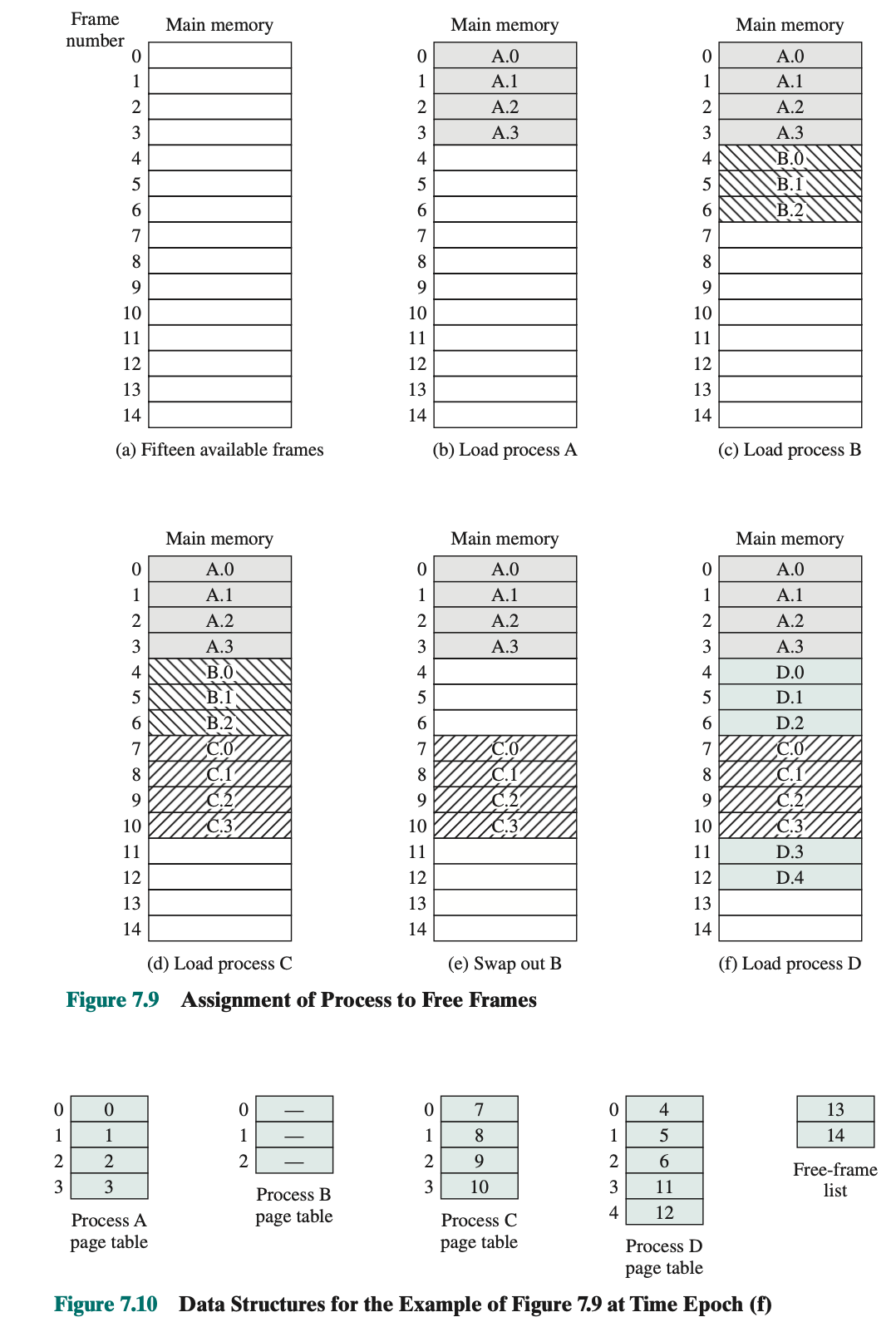 Each page table entry contains the number of the frame in main memory, if any, that holds the corresponding page. The OS maintains a single free-frame list of all the frames in main memory that are currently unoccupied and available for pages.