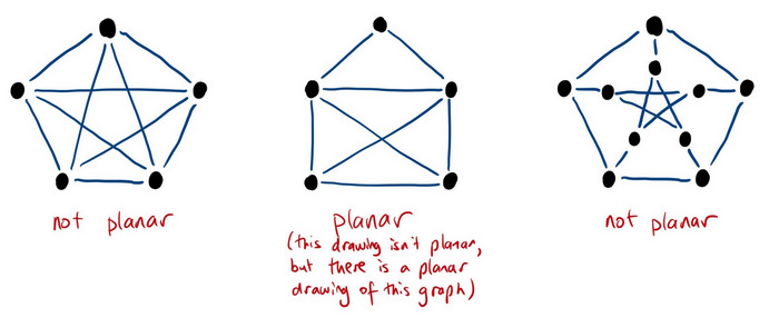 A planar graph is a graph that can be drawn without edges crossing (i.e. edges intersect only at their endpoints).