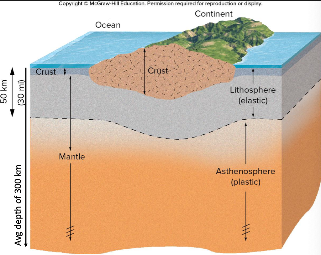 - Lithosphere - consists of crust and upper mantle; acts brittle and elastic