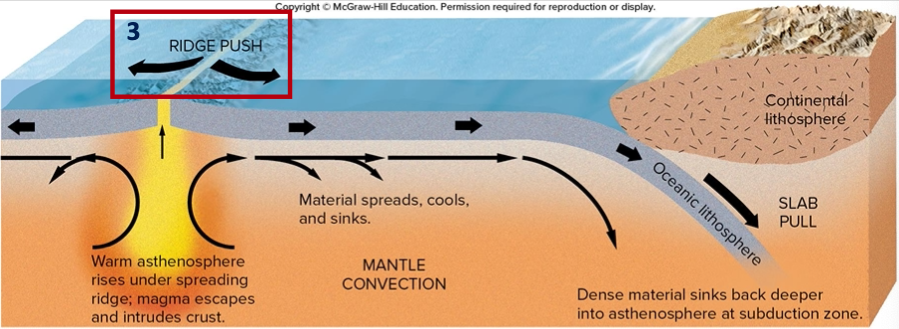 - Ridge Push Model - Starts at the topographic highs at spreading center with lithosphere sliding off aided by rising magma pushing them off and dragging asthenosphere with it