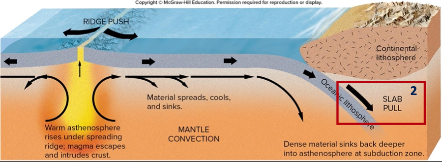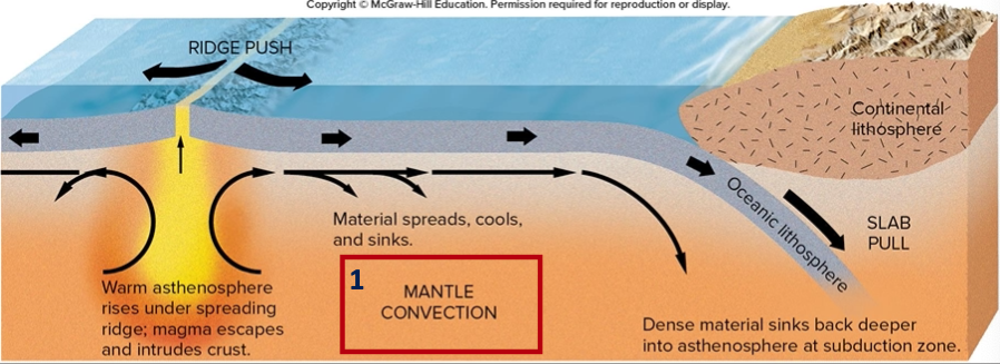 - Mantle Convection - Some rising magma at spreading centers spreads in upper asthenosphere, dragging overlying lithosphere with it and keeping spreading center open, until the dense oceanic crust sub-ducts. Creates convection cells within mantle.