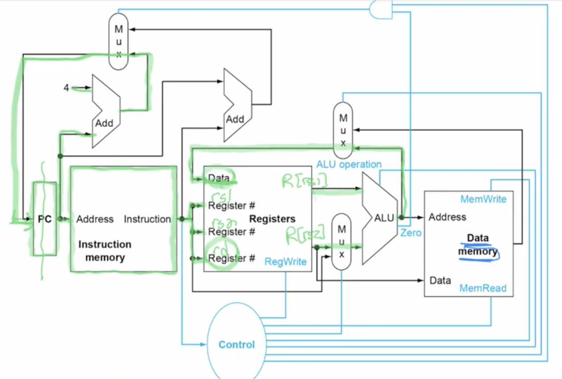 The ALU compares R[rs1] to R[s2] (by doing substraction actually), if the result comes out to be 1, meaning they are equal, it outputs this data called 0, the signal on this wire coming will equal 1. It will control the MUX. This mux determines what loads in the PC. We want to offset it by the immediate value instead of 4. The immediate value is part of the instruction which is converted to number. Current PC is added to the immediate to jump to the label if the branch is equal to 0.