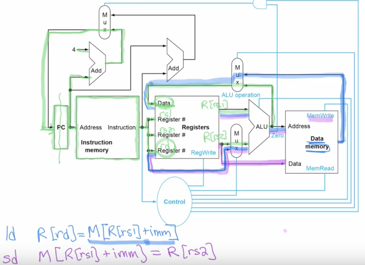 Send the data from the register to the memory. Storing in the memory. R[s1] + imm value comes into the ALU from the register file to denerate the address, instead of reading from data memory, we write the data and storing data into the data memory. R[s2] is used to send the data into the data memory, to do a MemWrite: store data instruction. Similar to ld, but we have the data coming from R[s2] into Data memory to write data instead.