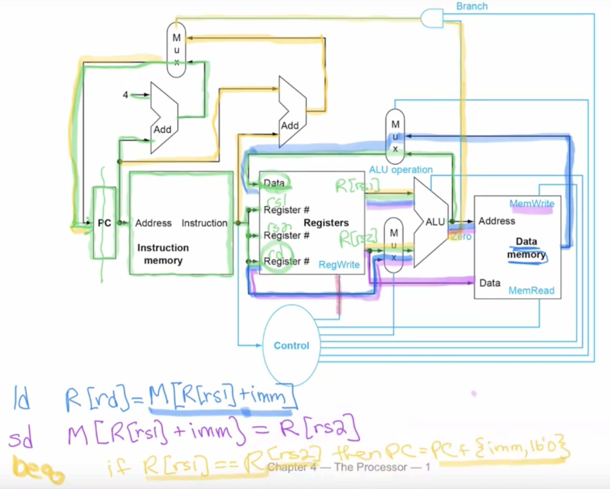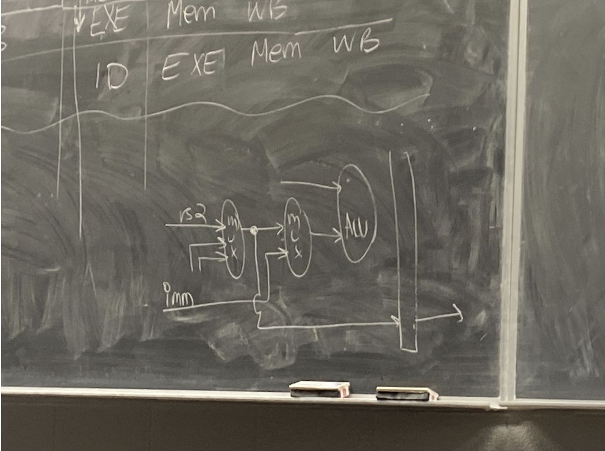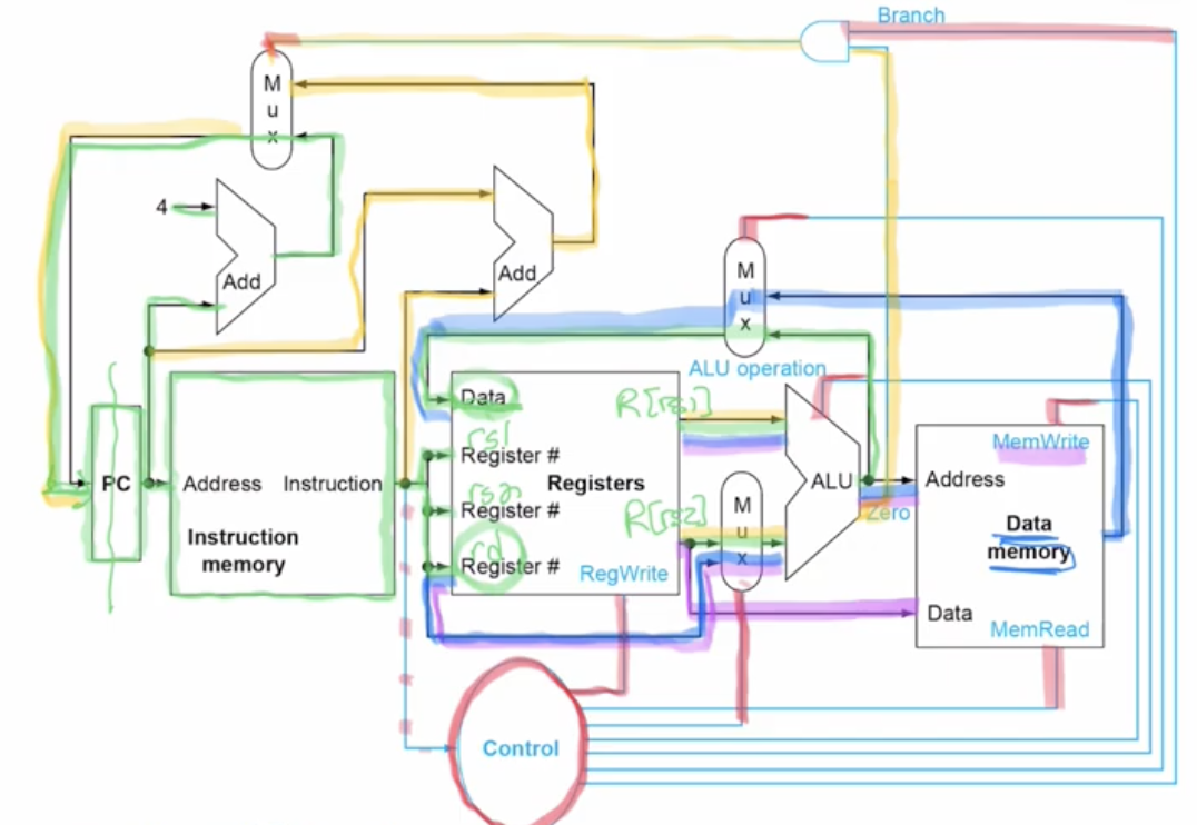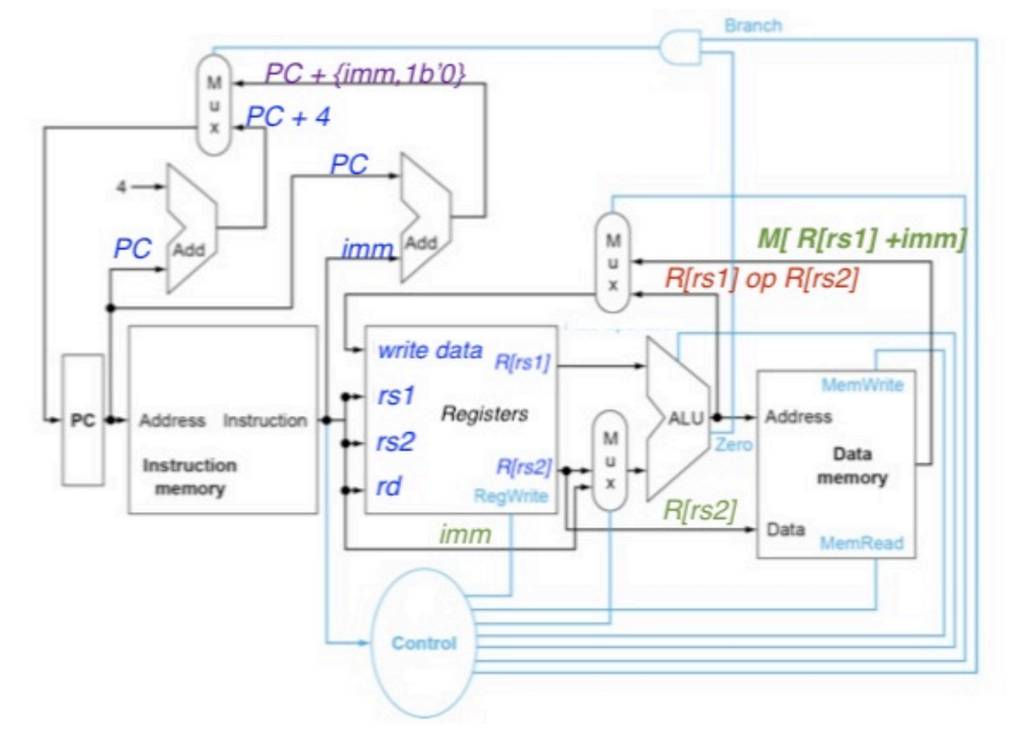 - The mux between the registers (Register file) and the ALU is for either using an immediate value or a register, based on the instruction.