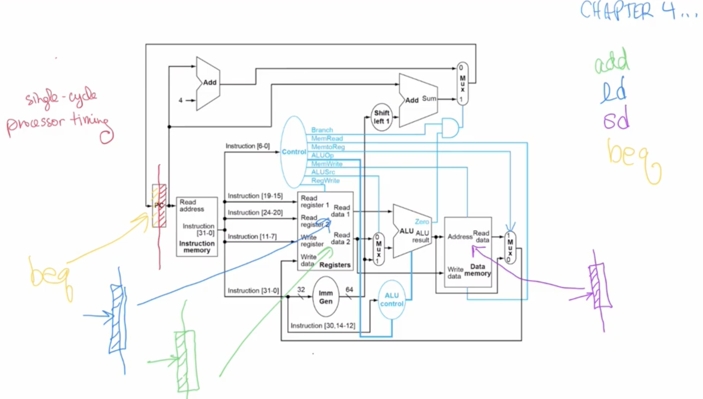 Add and beq are much shorter, because add only goes into instruction memory, register file, ALU and goes back gets written into the register file. Doesn’t propagate to the data memory.