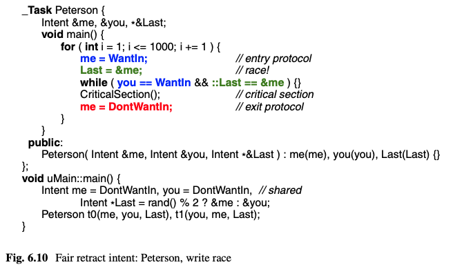 - If both threads arrive simultaneously, they both indicate their intent to enter and they both race to put the address of their me variable in Last.