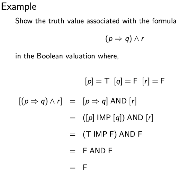 Definition: A Boolean valuation (BV) is a function from the set of wffs in propositional logic to the set Tr = {T, F}. The semantics of propositional logic are described using BV. The [] is a function mapping syntax to its value.