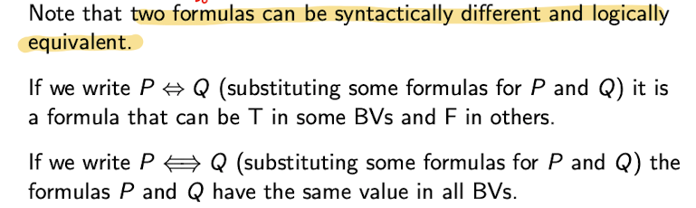 Definition: Two formulas, P and Q are logically equivalent if and only if all BV, [P] = [Q].
