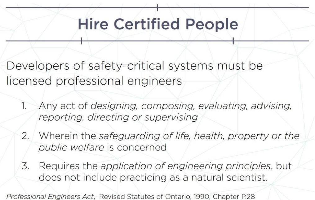 IN ONTARIO, (AND IN MOST OTHER PROVINCES IN CANADA), ANY DEVELOPER WHO CONTRIBUTES TECHNICALLY TO THE DEVELOPMENT OF A SAFETY-CRITICAL SYSTEM IS REQUIRED, BY LAW, TO BE LICENSED AS A PROFESSIONAL ENGINEER.