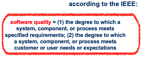 In the context of Software Engineering, software quality refers to two related but distinct notions:
