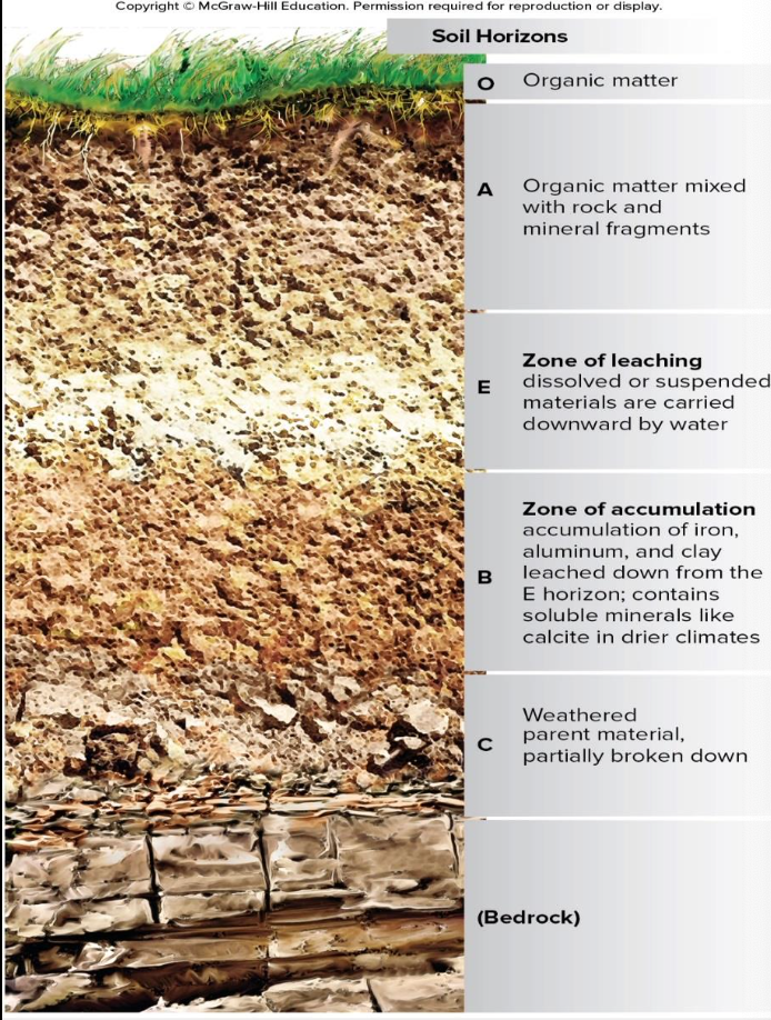 - E horizon/Zone of leaching: water and organic acids from above infiltrate and cause dissolution and transport (ie.e, leaching) of soluble minerals