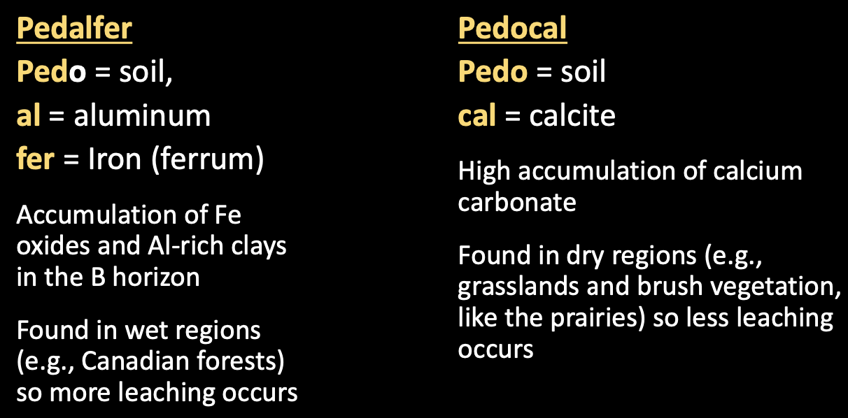 - B horizon/Zone of accumulation: accumulation of leaching products (e.g., Fe & AI hydroxides, clays, some calcite)l no organic matter