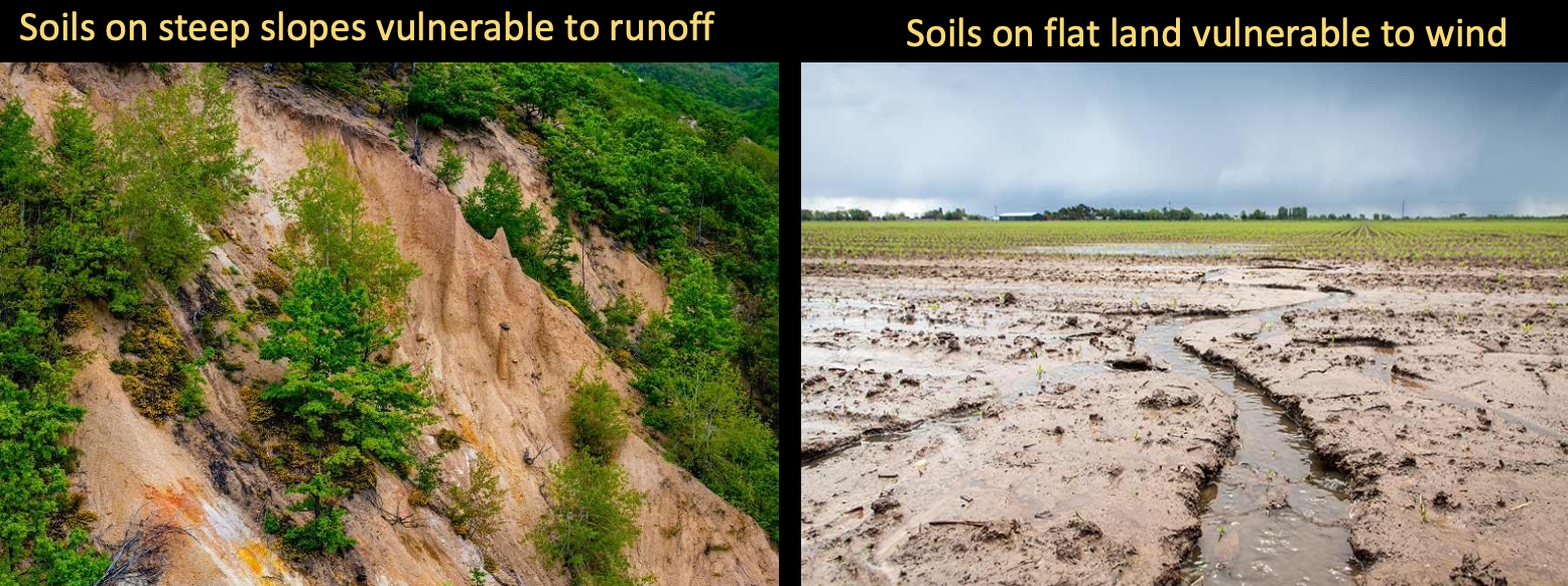 - Rain can breakup/loosen soil, then surface runoff and/or wind carry it away