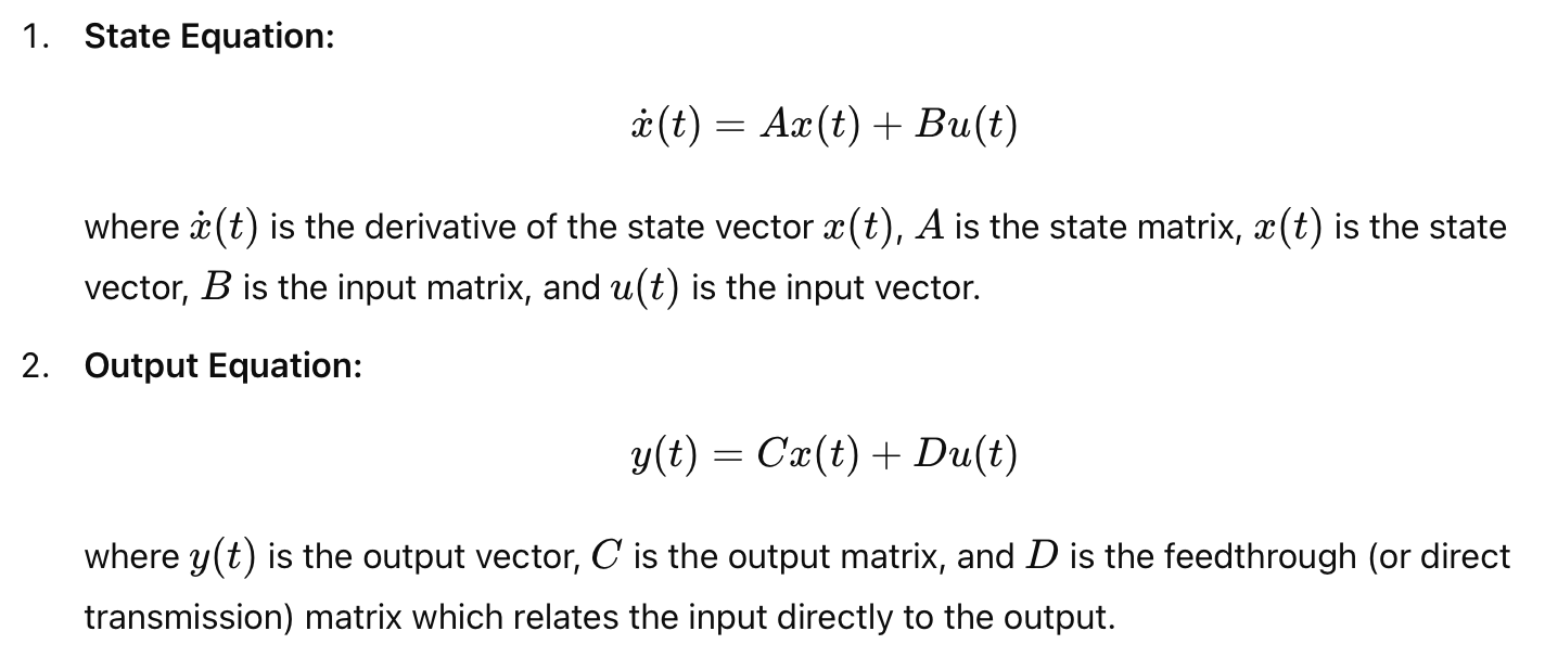State space representation is a mathematical model of a physical system as a set of input, output, and state variables related by first-order differential (or difference) equations. This model is widely used in control systems engineering for designing, analyzing, and simulating dynamic systems. The state space representation is particularly advantageous because it can model systems that are not necessarily easily described by transfer functions, especially when dealing with multiple inputs and outputs or systems that are inherently MIMO (Multiple Input, Multiple Output).