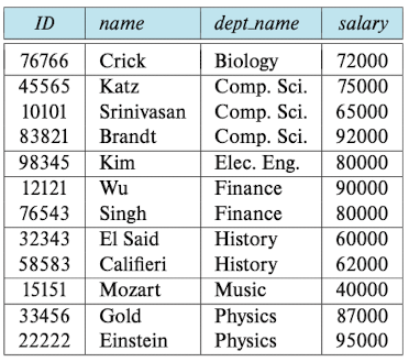 where T.salary > S.salary and S.dept_name = 'Biology'- T and S: think of them as copies of the relation instructor, they are declared as aliases