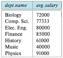 Grouped by the dept_name attribute. And then we compute the average salary of each group resulting to: