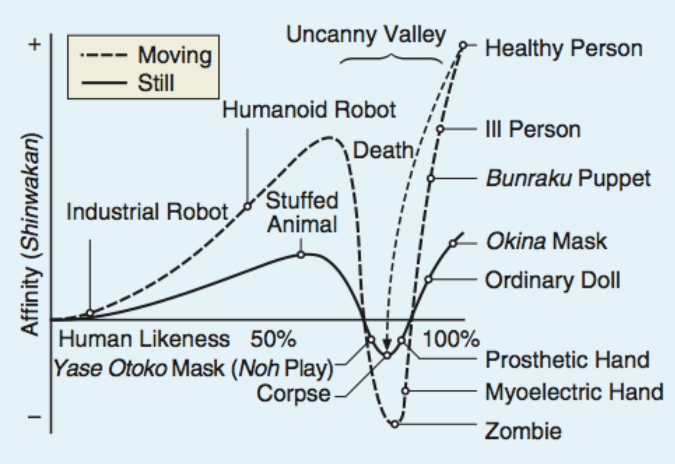 The Uncanney Valley is a hypothesized relation between an object’s degree of resemblance to a human being and the emotional response to the object. The concept suggests that humanoid objects that imperfectly resemble actual human beings provoke uncanny or strangely familiar feelings of uneasiness and revulsion in observers. “Valley” denotes a dip in the human observer’s affinity for the replica—a relation that otherwise increases with the replica’s human likeness.