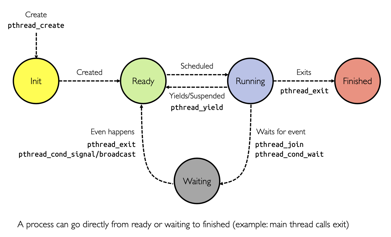 Key states for a thread: Running, Ready, and Blocked.