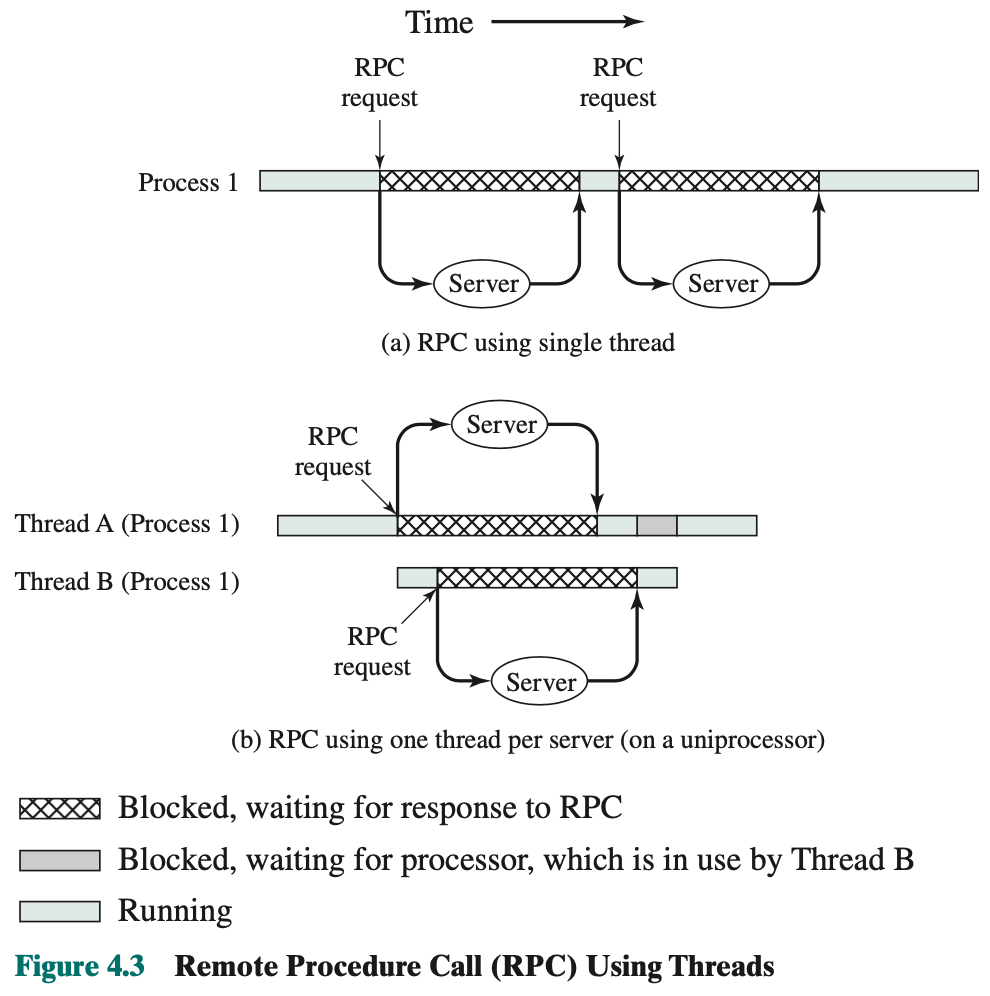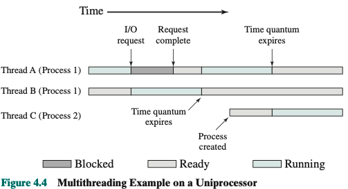 On a uniprocessor, multiprogramming enables the interleaving of multiple threads within multiple processes. In the example of Figure 4.4, three threads in two processes are interleaved on the processor. Execution passes from one thread to another either when the currently running thread is blocked or when its time slice is exhausted