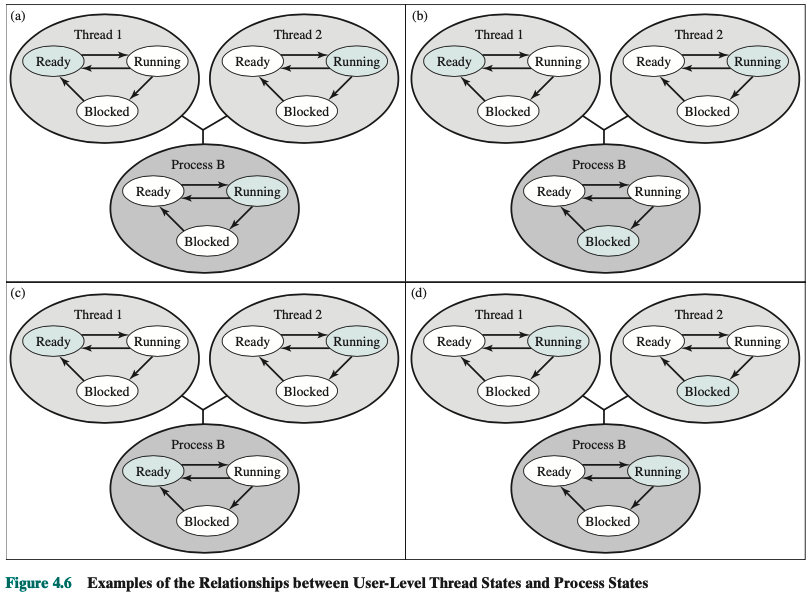 Thus, a process may be in the midst of a thread switch from one thread to another when interrupted. When that process is resumed, execution con- tinues within the threads library, which completes the thread switch and transfers control to another thread within that process.