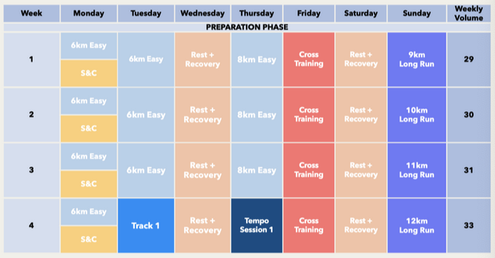 The first month of your half marathon training is the prep phase. This is when you’ll build the foundation in your muscles and joints by slowly increasing distance each week. This phase is important for minimizing common problems like shin splints and knee pains during your training, so you should avoid the temptation to ramp up too quickly. If you already know that you can handle the weekly mileage specified here, then you could choose to start with slightly higher miles, but I recommend focusing on just getting faster each week instead.
