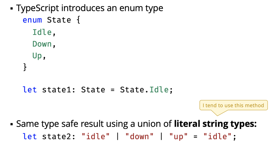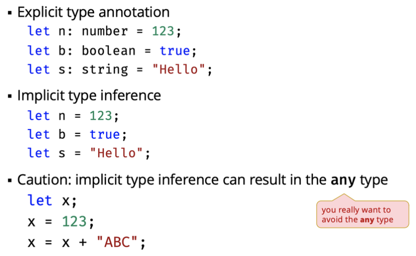 - When you don’t give the variable an explicit type annotation, or an initial value so it can do implicit type inference, it’s the