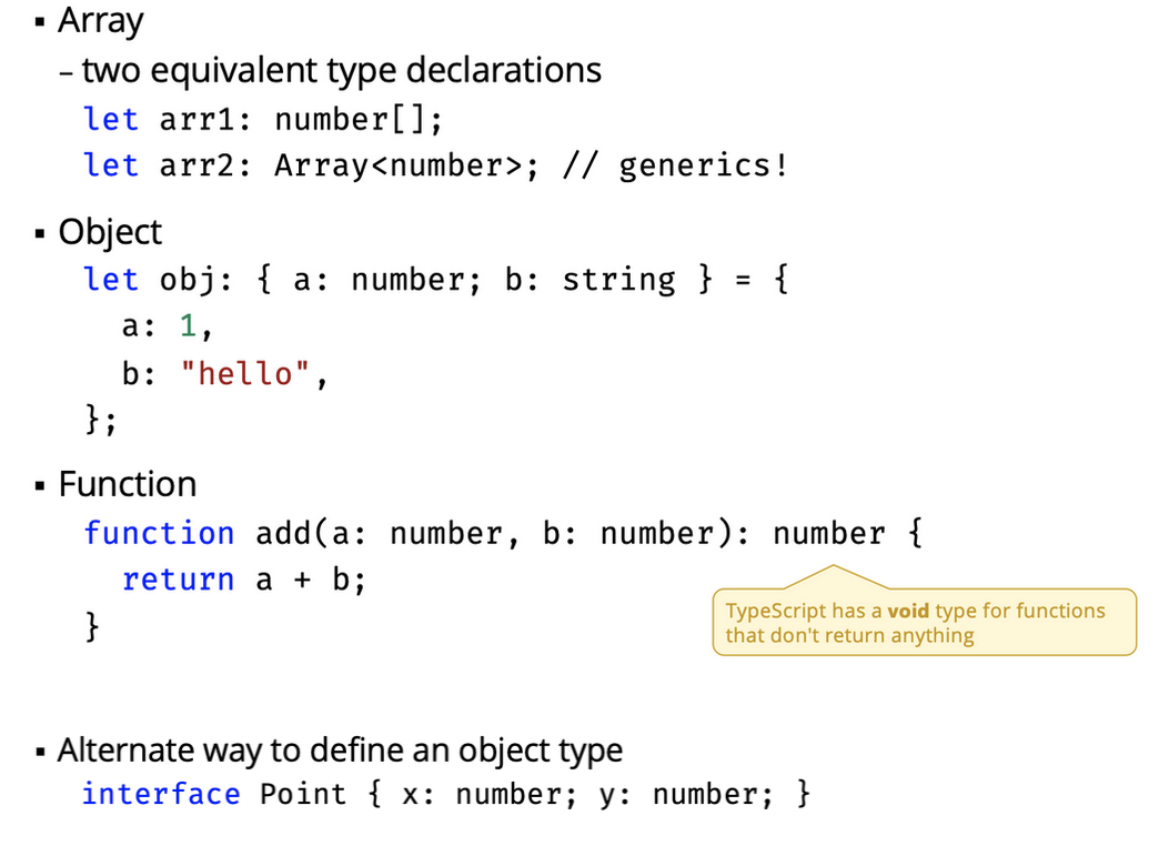 TypeScript is JavaScript with Type checking. A superset of JS. First learned in CS349.