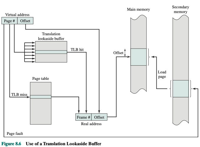 - Most virtual memory schemes make use of a special high-speed cache for page table entries, usually called a translation lookaside buffer (TLB)