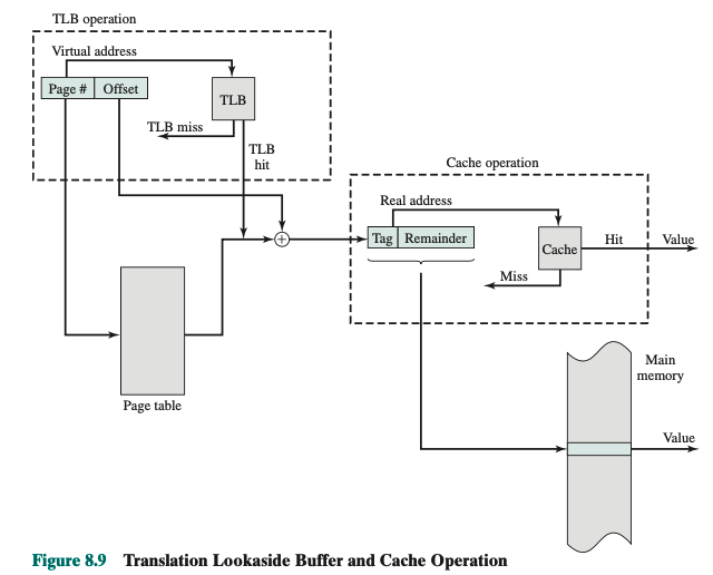 - Finally, the virtual memory mechanism must interact with the cache system (not the TLB cache, but the main memory cache). This is illustrated in Figure 8.9. A virtual address will generally be in the form of a page number, offset.