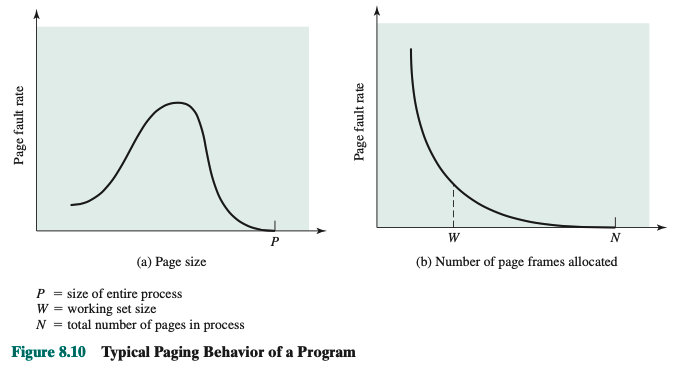 - In Figure 8.10b, shows that for a fixed page size, the fault rate drops as the number of pages maintained in main memory grows.