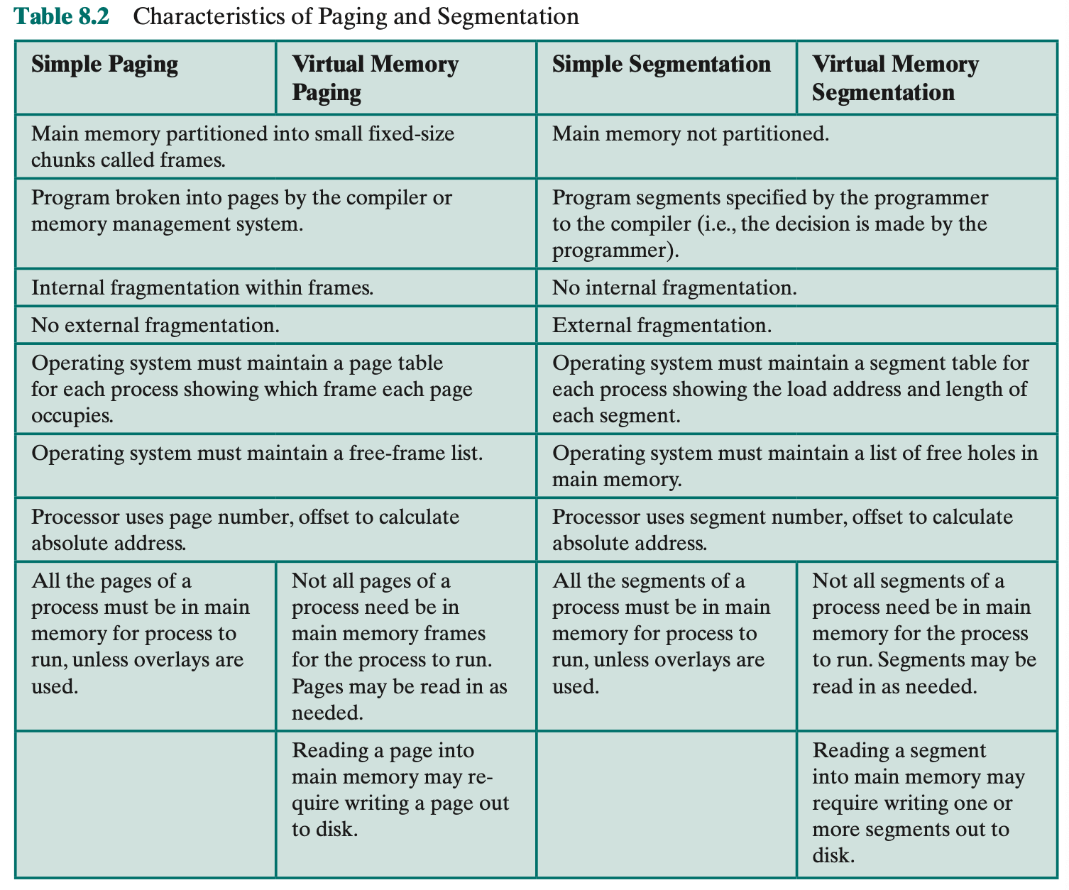 - A process may be broken up into a number of pieces (pages or segments) and these pieces need not be contiguously located in main memory during execution. The combination of dynamic run-time address translation and the use of a page or segment table permits this.